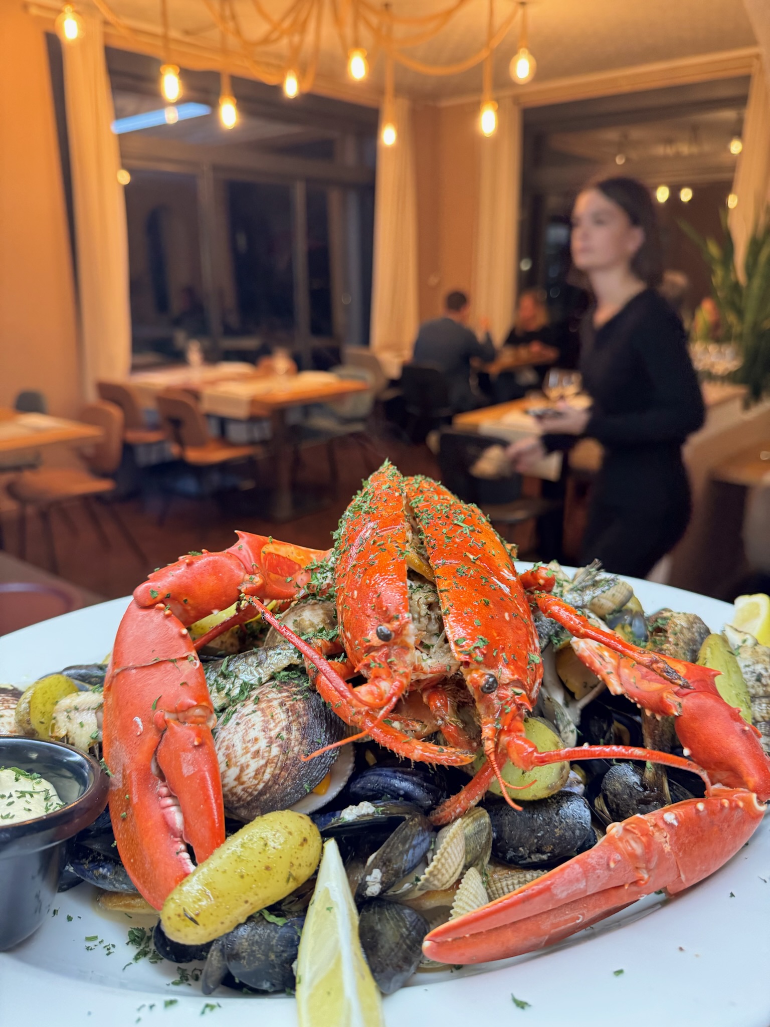 L'Océanique (sur commande) 18 huîtres sélection Eden n°3, 6 huîtres de Méditerranée n°2, 6 huîtres d'exception Gillardeau n°4 La Baie de Sinche, 12 crevettes roses BIO de Madagascar, 12 bulots de Granville, 8 praires blanches de Granville, 6 palourdes Bretonnes, 4 gambas de Madagascar, 1 homard Bleu entier 400/600grs cuit à la vapeur Pour 2 personnes 190€00.